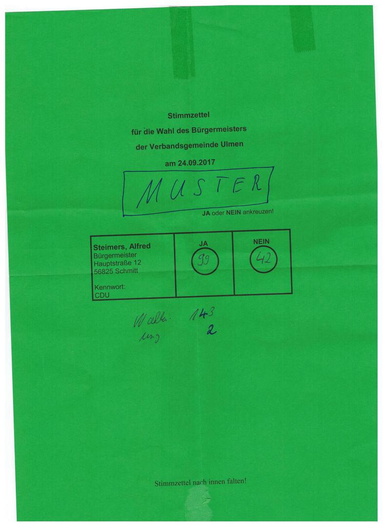 Ergebnis der Wahl des Bürgermeisters der Verbandsgemeinde Ulmen in Urschmitt am 24.09.2017
